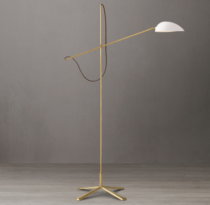 Designer Aerin Lauder of New York redefines modern grandeur with Graphic, featuring a dramatic cup shade on a minimalist frame crafted of powdercoated steel in a hand-rubbed antique brass finish. A rotating boom arm extends from the sculptural, slender base, directing a focused swath of light wherever it's needed.